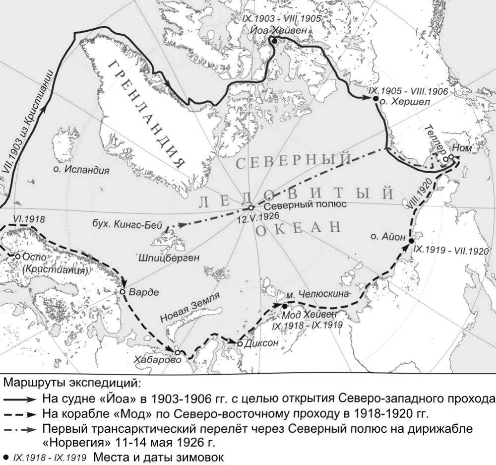 В 1901 г. получил звание капитана дальнего плаванья. На парусно-моторной яхте «Йоа» впервые в истории преодолел Северно-Западный проход, перед этим проведя часы в гамбургской морской геофизической обсерватории за овладением необходимыми для экспедиции знаниями. В 1911 г. первым открыл и пересек хребет Куин-Мод. В том же году, благодаря верному расчету избежав на своем пути сильных морозов, покорил Южный полюс, перед этим пройдя курс океанографии и получив аудиенцию Эдуарда VII – короля Соединенного Королевства Великобритании и Ирландии. В 1912 г. оставил членство в Королевском географическом обществе. С 1918 по 1920 гг. Амундсен проплыл всё арктическое побережье Евразии, назвав точные координаты мыса Челюскин, и внедрил в практику арктических исследований новые технические средства, включая авиацию, гидросамолеты и дирижабли. Все перечисленное подчеркивает огромный вклад Руаля Амундсена в мировую науку. При этом Руаль испытывал серьезные финансовые затруднения – уже в 1924 г. он объявил себя банкротом, чем вызвал большой скандал в Норвегии.