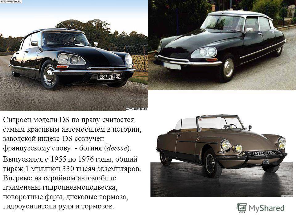Ситроен модели DS по праву считается самым красивым автомобилем в истории, заводской индекс DS созвучен французскому слову – богиня (deesse). Выпускался с 1955 по 1976 годы, общий тираж 1 миллион 330 тысяч экземпляров. Впервые на серийном автомобиле применены гидропневмоподвеска, поворотные фары, дисковые тормоза, гидроусилители руля и тормозов.