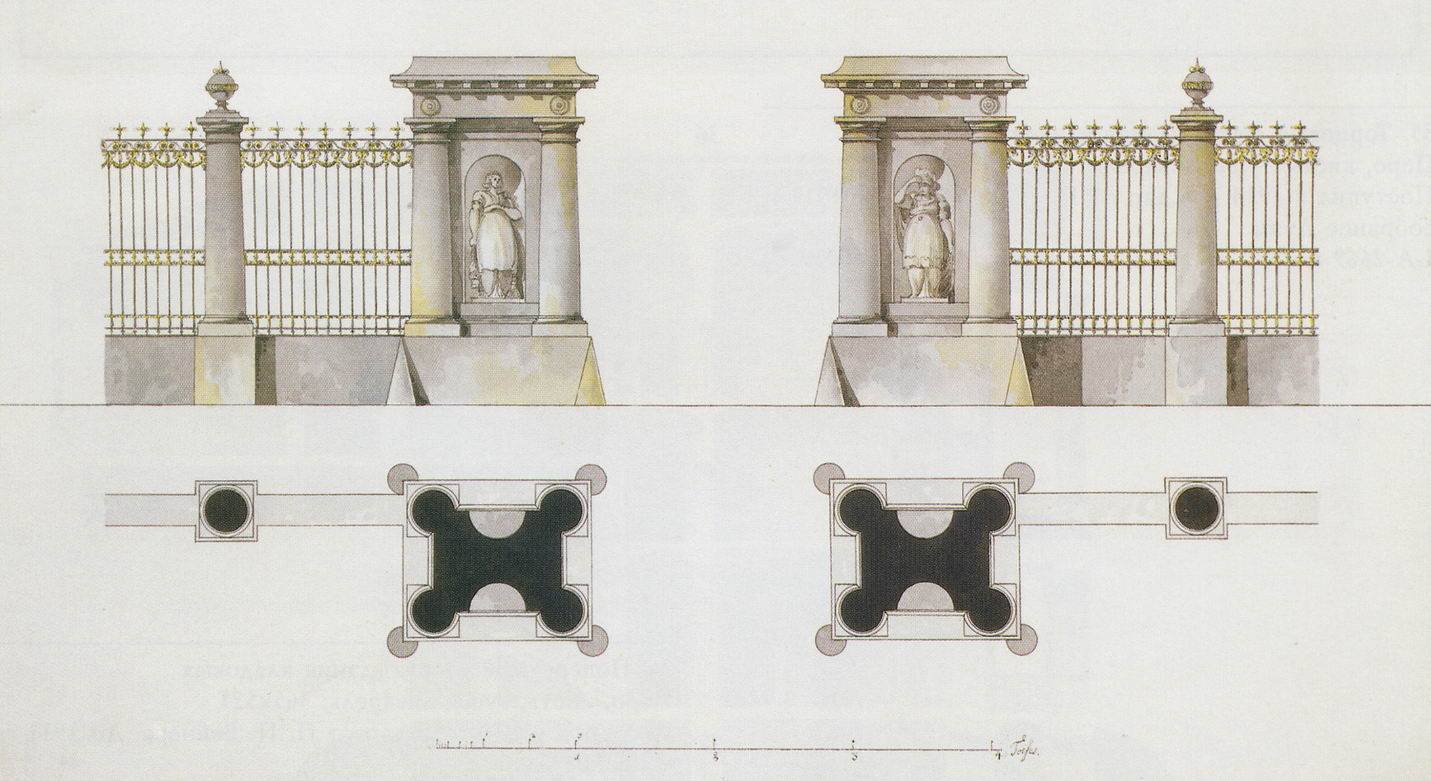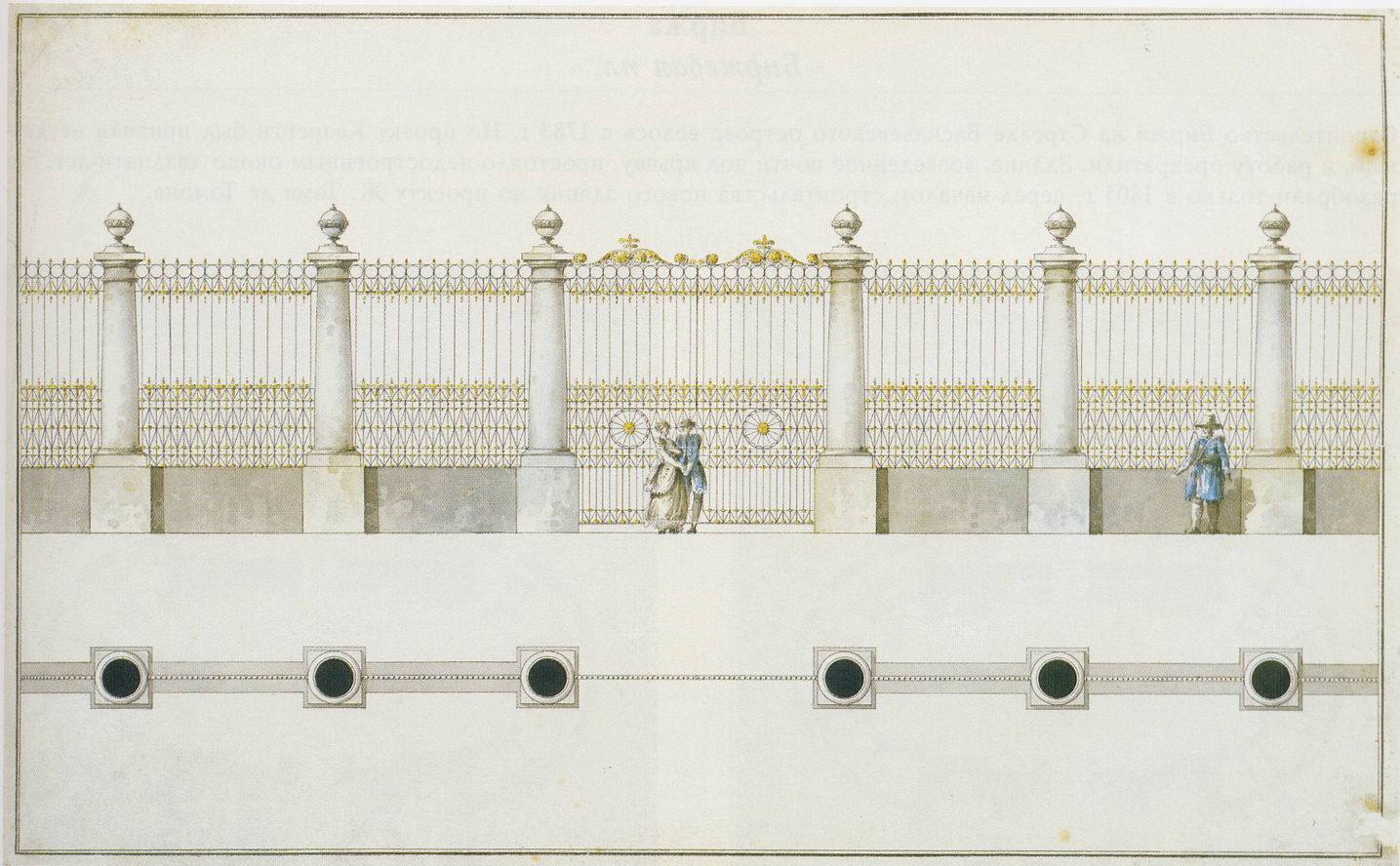 Художественную чугунную ограду со стороны Садовой улицы установили в 1791 году. Она выполнена в Петрозаводске по рисунку Кваренги. Считается, что за основу была взята ограда Летнего сада. Копия, выполненная Кваренги, хранится в собрании Национального музея в Варшаве.