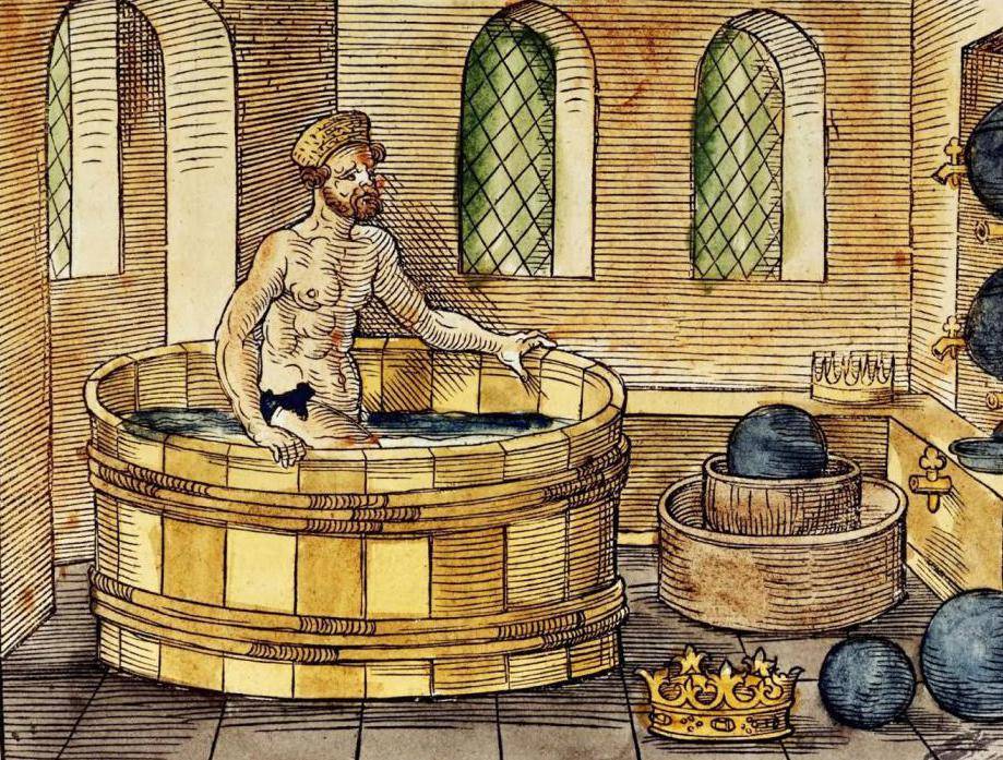 Во время купания ученый заметил, что уровень воды в ванне увеличивается, когда он входит в нее. Он понимает, что этот эффект можно использовать для определения объема короны.
