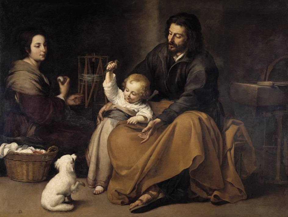 Счастье материнства у Мурильо передано с особой теплотой. Сам художник был счастлив в браке, эта тема была ему близка. Но, как уже было сказано выше, художник религиозные темы часто решал через жанровое повествование, это его ничуть не смущало.Вот и на данной картине изображена сцена обычной жизни очень небогатой семьи. Святой Иосиф поддерживает маленького Иисуса, играющего с птичкой и собакой. Причём Иосиф показан не старым, а средних лет мужчиной с испанскими чертами лица. Слева Дева Мария перематывает нитки, но вся она поглощена игрой ребёнка.Справа композицию завершает столярный верстак, что напоминает зрителю о роде занятий Иосифа (он был плотником). Все полотно проникнуто теплом домашнего уюта и семейного счастья.Вот ещё несколько изображений мадонн.