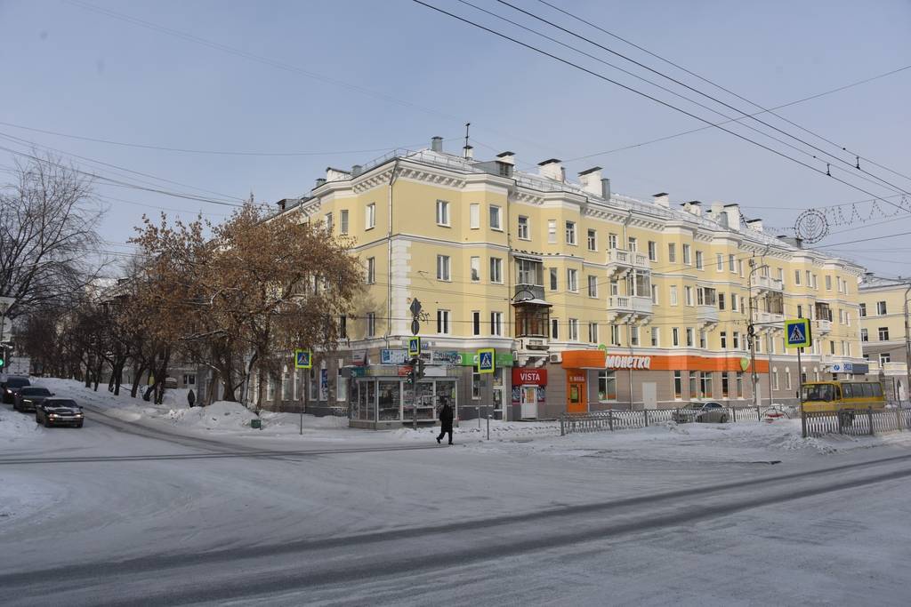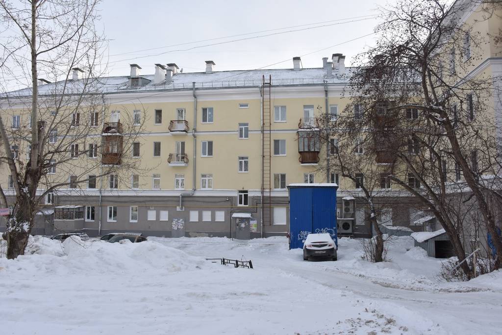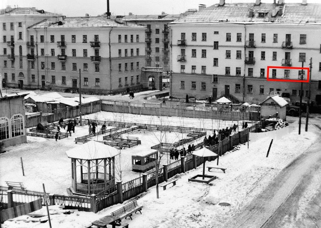 Красным цветом выделены окна квартиры №17, где жили Ельцины (1950-е годы). Внутри за крайним левым окном располагалась кухня (в ней стояла печь), за другими окнами – жилые комнаты. Фото: Архив музея завода Уралхиммаш
