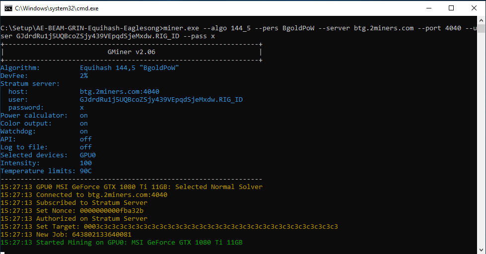 Окно Gminer при майнинге Bitcoin Gold на 2Miners