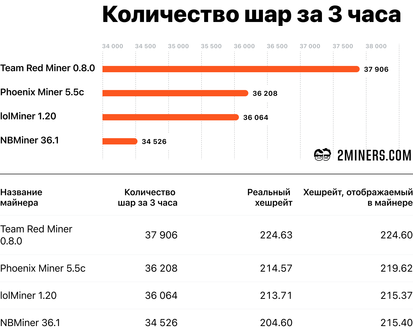 Первое место в очередной раз занял TeamRedMiner. На этот раз он оторвался намного больше от конкурентов, его хешрейт оказался выше второго места почти на 5 процентов. Любопытно, что хешрейт TRM на пуле и в майнере оказался почти идентичен. Это может говорить, например, о том, что TeamRedMiner не учитывает комиссию при расчете хешрейта.