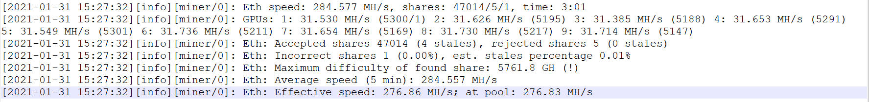 - Eth: Effective speed: 276.86 MH/s; at pool: 276.83 MH/s