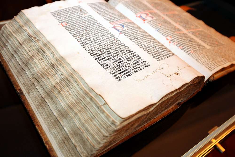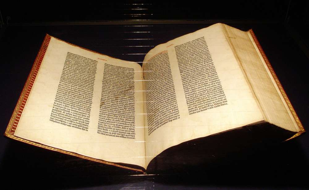 Вышла из-под первого станка одной из первых, люди окрестили ее Библией Гутенберга. При работе над Библией станок и технология работы на нем были усовершенствованы: