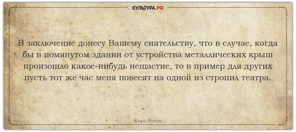 - В 1827 году архитектор получает новый заказ – театр на Александрийской площади. Его предстояло возвести на месте старого театра, который проектировал учитель Росси, Винченцо Бренна. В итоге архитектор создал целую улицу – Театральную, а ныне улицу Зодчего Росси. Карл Иванович также возвел на улице новое здание Императорской Публичной библиотеки. После открытия театра Росси выплатили гонорар и выдали одну из лож в пожизненное пользование. Однако лично архитектор ей никогда не пользовался, а сдавал в аренду, для погашения долгов, которые Росси имел всю жизнь.