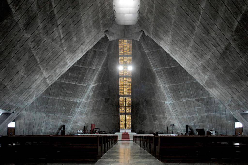 Собор, возведенный более 50 лет назад, выглядит современным и сейчас. Мистически притягательный, он похож на взмывающий в небо космический корабль. Блестящая нержавеющая сталь фасада контрастирует с серым бетоном, который используется в интерьере.