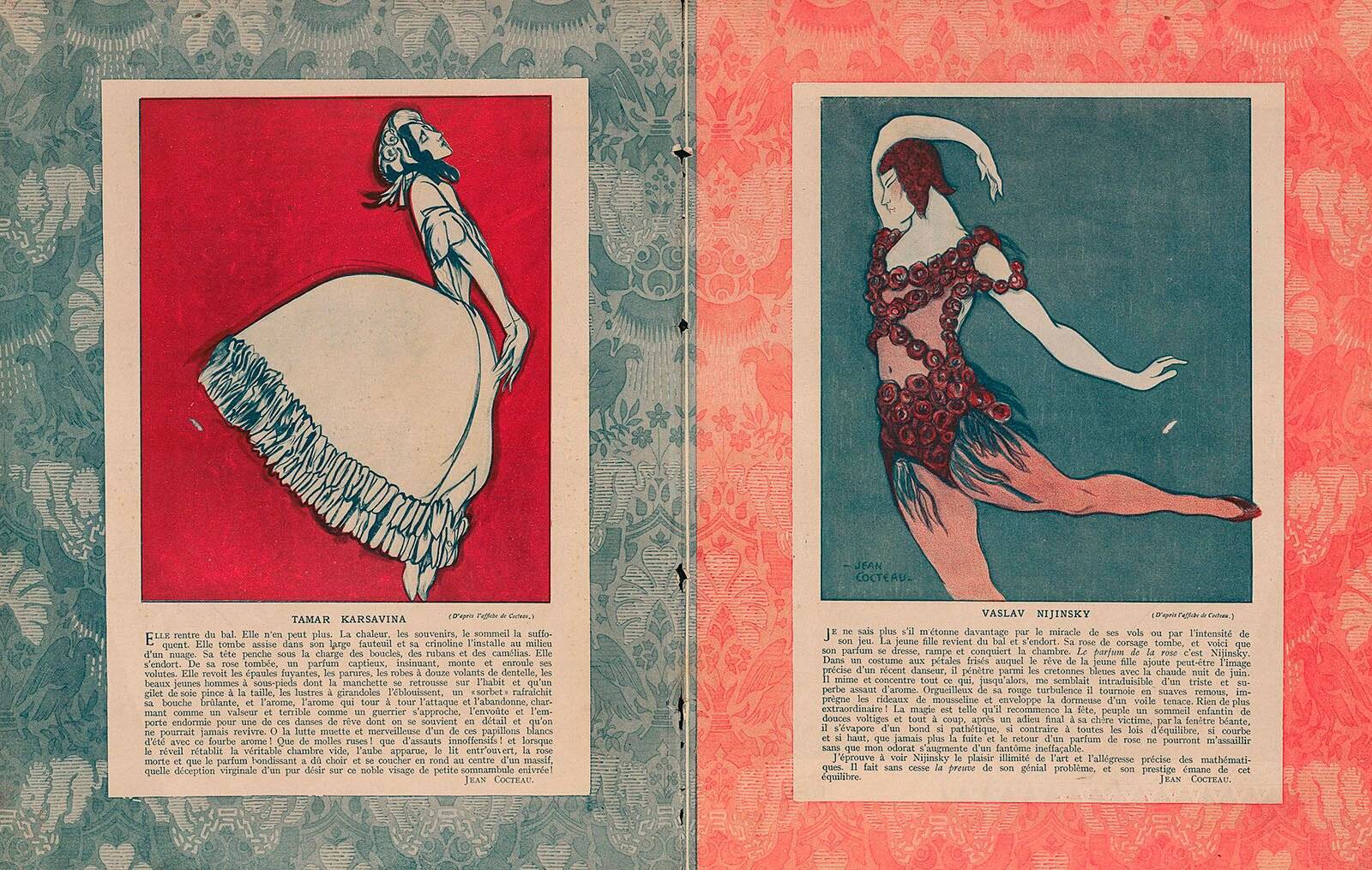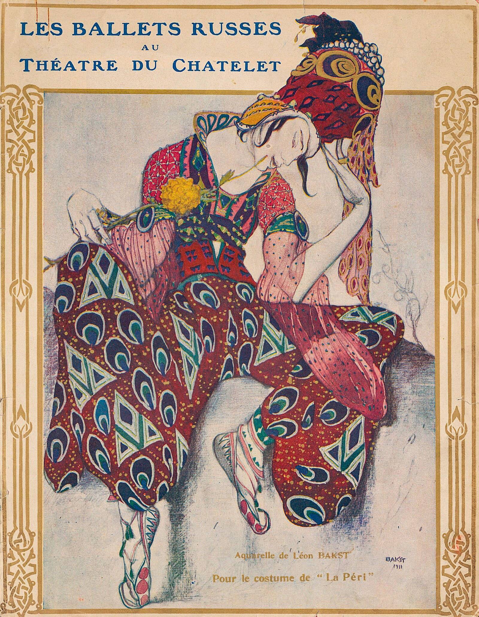 Художник Леон (Лев) Бакст, соратник Дягилева по объединению «Мир искусства», создал декорации и эскизы костюмов для многих балетов Русских сезонов. Иногда эскизы к одному спектаклю служили анонсом к другому балету. Так, на программе балета «Нарцисс и Эхо», показанном на гастролях в парижском театре Шатле в 1911 году, художник изобразил танцовщика Вацлава Нижинского в образе Искандера из балета Поля Дюка «Пери». Работа над двумя балетами велась одновременно, над сценографией и костюмами трудился Бакст, а главные партии в обоих должен был исполнить Нижинский. Сначала состоялась премьера «Нарцисса и Эхо», «Пери» была показана лишь через год. За это время кое-что поменялось: вместо Нижинского в балете «Пери» на сцену вышел другой танцовщик. Так что этот рисунок Бакста на обложке программы балета «Нарцисс и Эхо» — единственное изображение Нижинского, репетирующего в 1911 году партию Искандера.