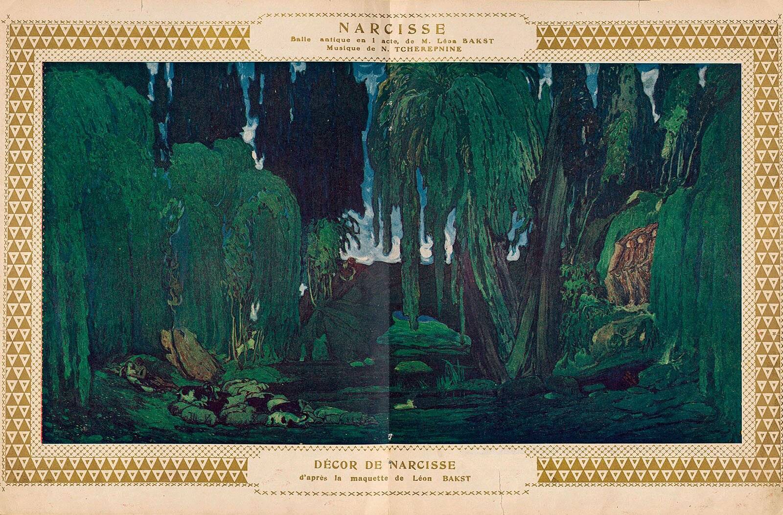 Хореографию к одноактному балету «Нарцисс и Эхо» сочинил Михаил Фокин на музыку Николая Черепнина. Либретто и сценографию сделал Бакст. Балет основан на древнегреческом мифе, описанном в «Метаморфозах» Овидия. Прекрасный речной бог Нарцисс отверг нимфу Эхо и в наказание за это влюбился в собственное отражение в реке. Он не мог от него оторваться и умер на берегу, превратившись в цветок, а Эхо от горя стала камнем. В балете Фокина Нарцисс заставлял Эхо повторять каждое свое движение, как бы издеваясь над ней. Роль нимфы Эхо исполнила Тамара Карсавина, а вакханки — сестра Нижинского Бронислава.