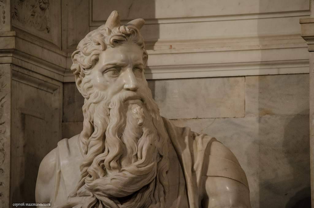 Микеланджело изобразил на своей скульптуре Моисея с рогами. Многие историки искусства объясняют это неправильным толкованием Библии. В Книге Исхода говорится, что когда Моисей спустился с горы Синай со скрижалями, израильтянам было трудно смотреть в его лицо. В этом месте в Библии употреблено слово, которое с иврита можно перевести и как «лучи», и как «рога». Однако по контексту однозначно можно сказать, что речь идёт именно о лучах света — что лицо Моисея сияло, а не было рогато.