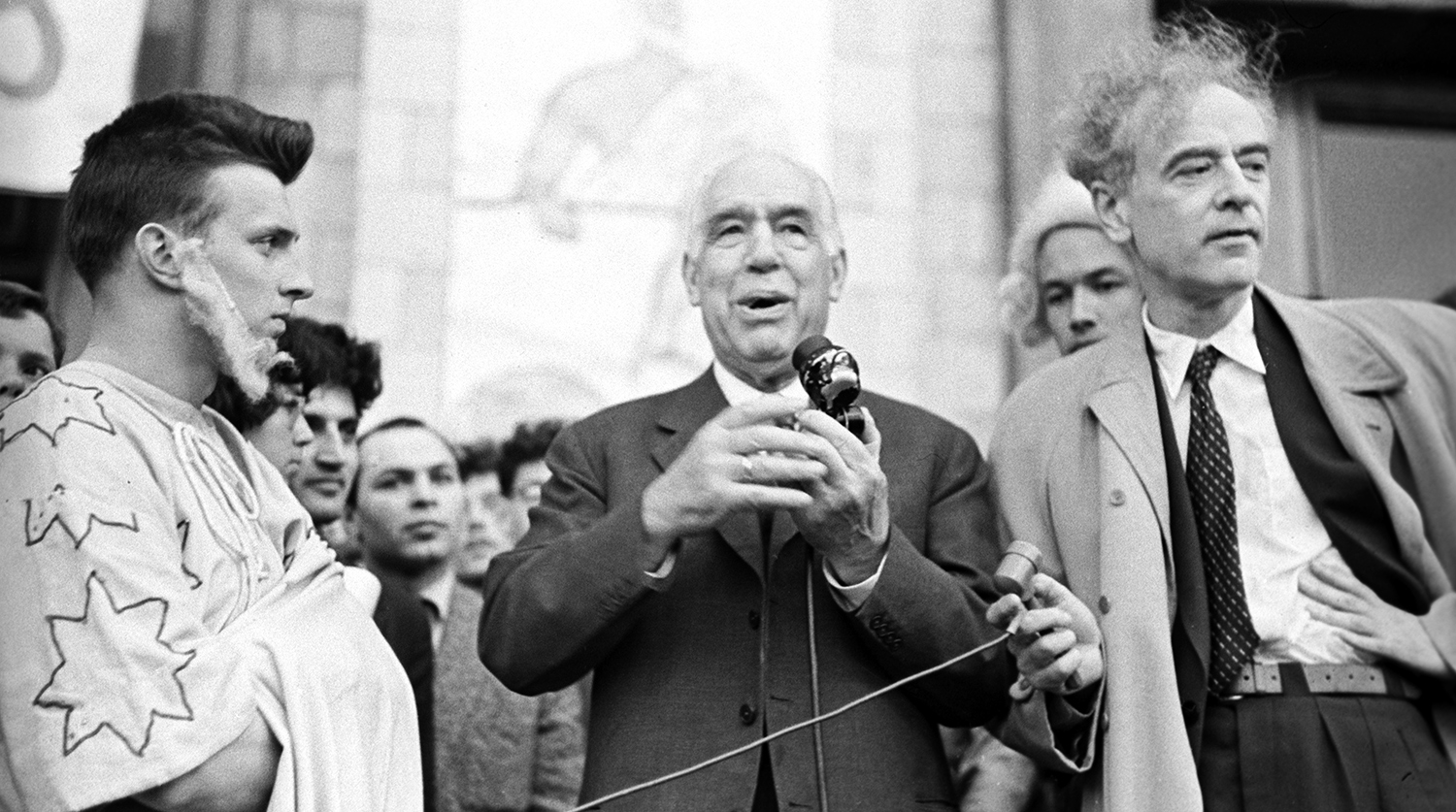 Президент Датской королевской академии наук Нильс Бор (в центре) и академик АН СССР, физик Лев Ландау (справа) на празднике студентов Московского государственного университета в честь дня рождения Архимеда, 1961 год