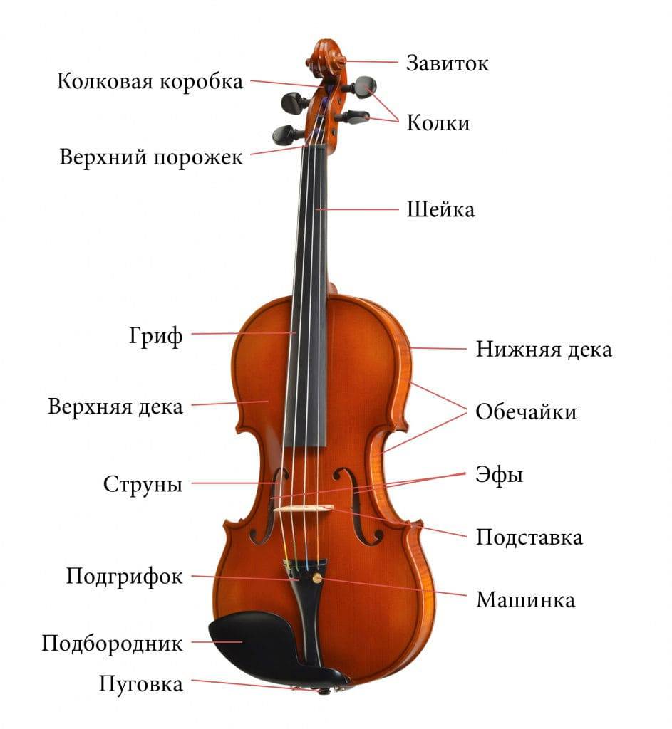 Струнный смычковый инструмент имеет узнаваемую конструкцию, состоит из корпуса, грифа и четырех струн. Скрипка устроена довольно сложно. Чтобы она могла звучать, подобно «человеческому голосу», передавать мысли и настроение композитора, вызывать эмоции у слушателя, важны все детали скрипки.