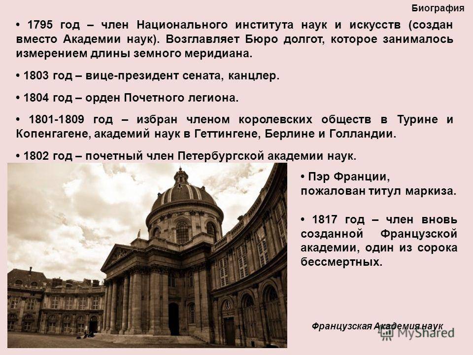 Пэр Франции, пожалован титул маркиза год – член вновь созданной Французской академии, один из сорока бессмертных. Французская Академия наук Биография 1795 год – член Национального института наук и искусств (создан вместо Академии наук). Возглавляет Бюро долгот, которое занималось измерением длины земного меридиана год – вице-президент сената, канцлер год – орден Почетного легиона год – избран членом королевских обществ в Турине и Копенгагене, академий наук в Геттингене, Берлине и Голландии год – почетный член Петербургской академии наук.