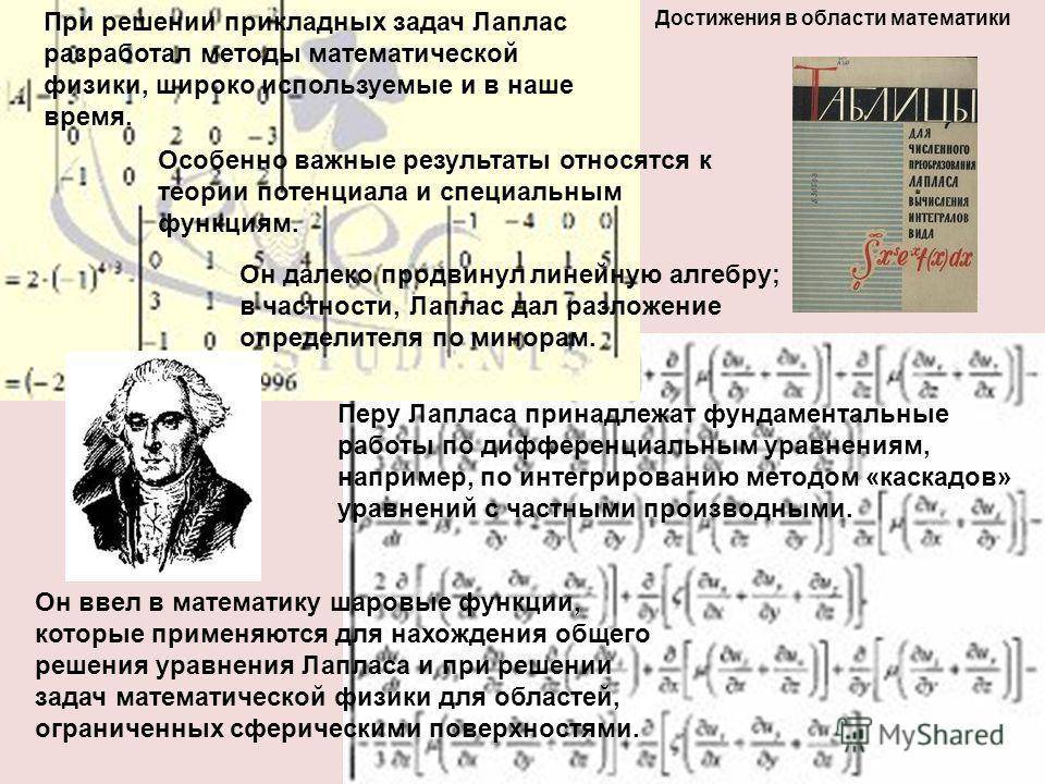 Он ввел в математику шаровые функции, которые применяются для нахождения общего решения уравнения Лапласа и при решении задач математической физики для областей, ограниченных сферическими поверхностями. Достижения в области математики При решении прикладных задач Лаплас разработал методы математической физики, широко используемые и в наше время. Особенно важные результаты относятся к теории потенциала и специальным функциям. Он далеко продвинул линейную алгебру; в частности, Лаплас дал разложение определителя по минорам. Перу Лапласа принадлежат фундаментальные работы по дифференциальным уравнениям, например, по интегрированию методом «каскадов» уравнений с частными производными.