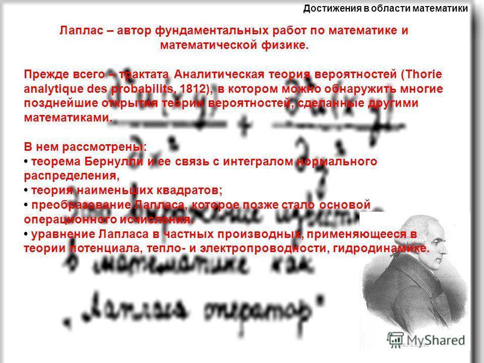 Достижения в области математики Лаплас – автор фундаментальных работ по математике и математической физике. Прежде всего – трактата Аналитическая теория вероятностей (Thorie analytique des probabilits, 1812), в котором можно обнаружить многие позднейшие открытия теории вероятностей, сделанные другими математиками. В нем рассмотрены: теорема Бернулли и ее связь с интегралом нормального распределения, теория наименьших квадратов; преобразование Лапласа, которое позже стало основой операционного исчисления. уравнение Лапласа в частных производных, применяющееся в теории потенциала, тепло- и электропроводности, гидродинамике.