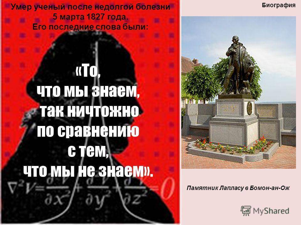 Умер ученый после недолгой болезни 5 марта 1827 года. Его последние слова были: Памятник Лапласу в Бомон-ан-Ож Биография «То, что мы знаем, так ничтожно по сравнению с тем, что мы не знаем».