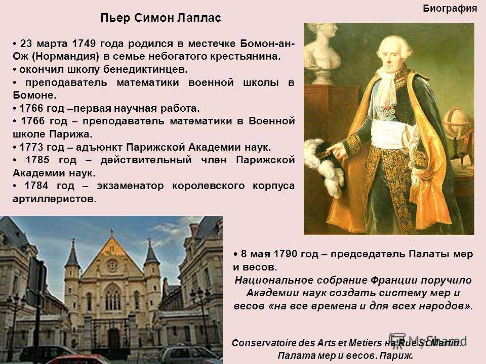 Биография 8 мая 1790 год – председатель Палаты мер и весов. Национальное собрание Франции поручило Академии наук создать систему мер и весов «на все времена и для всех народов». Conservatoire des Arts et Metiers на Rue St Martin. Палата мер и весов. Париж. 23 марта 1749 года родился в местечке Бомон-ан- Ож (Нормандия) в семье небогатого крестьянина. окончил школу бенедиктинцев. преподаватель математики военной школы в Бомоне год –первая научная работа год – преподаватель математики в Военной школе Парижа год – адъюнкт Парижской Академии наук год – действительный член Парижской Академии наук год – экзаменатор королевского корпуса артиллеристов. Пьер Симон Лаплас
