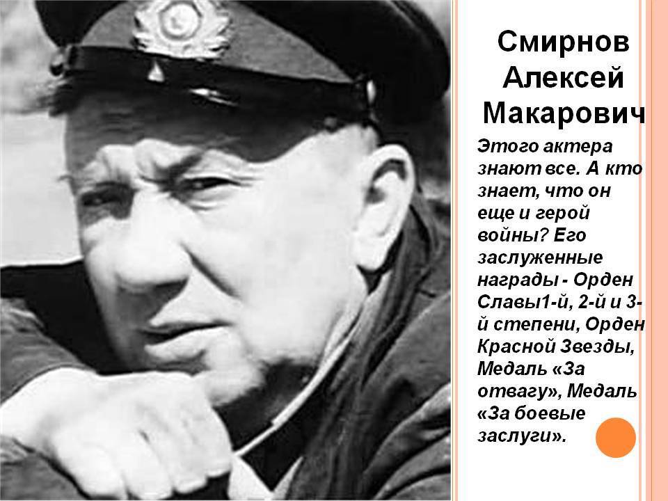 Скромный актер Алексей Смирнов, биография которого насыщена событиями, встретил победу в звании гвардии старшина, но в это время он был уже в запасе, так как в одном из боев был ранен, контужен, и впоследствии его комиссовали.