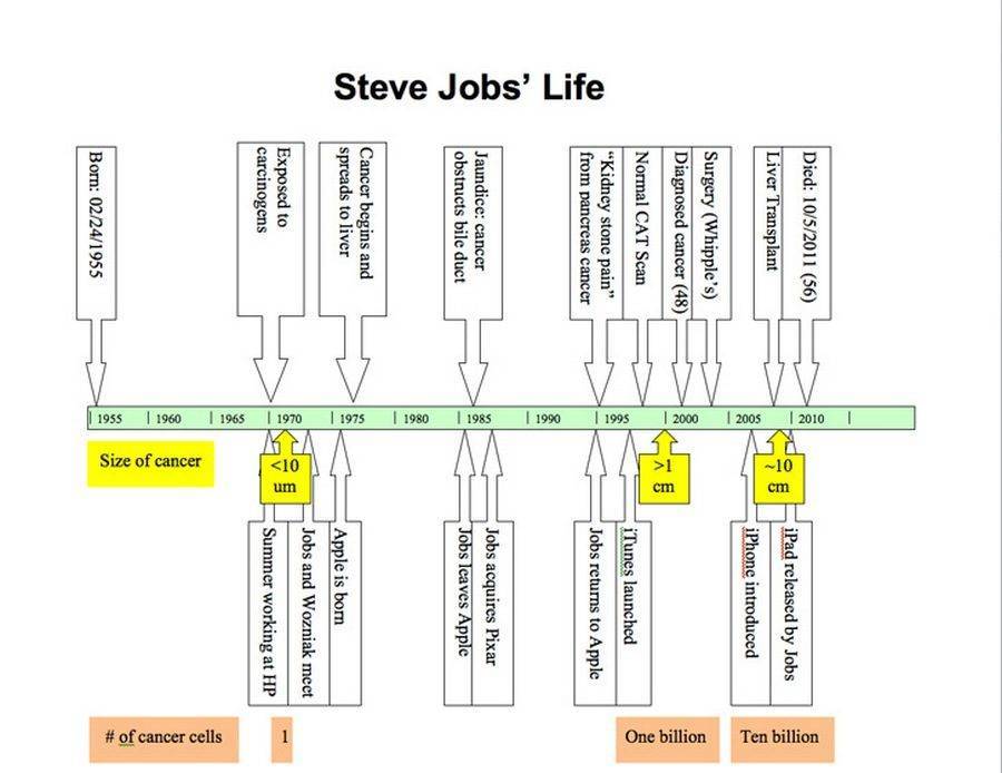 Естественная история роста рака поджелудочной железы Стива Джобса может быть определена путем математических расчетов. Промежуток времени между его диагнозом, поставленном в возрасте 48 лет, и его смертью в возрасте 56 лет был около 8 лет (с октября 2003 года по 5 октября 2011 года). Из этих дат может быть определено, что масса опухоли в его поджелудочной железе удваивалась в размере каждые 10 месяцев. (Как правило, твердые опухоли различных органов удваиваются в размере каждые 3-9 месяцев.) Его опухоль характеризовалась очень медленным ростом.
