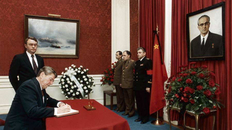 Президент Рональд Рейган оставляет запись в книге соболезнований в посольстве СССР после смерти Юрия Андропова