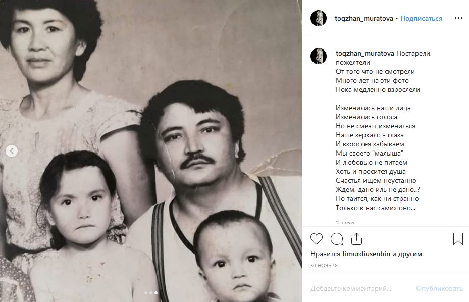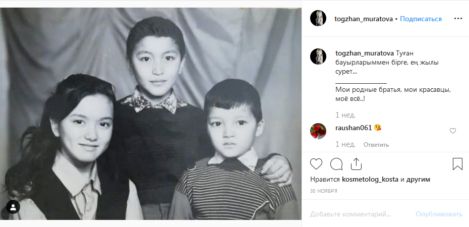Про семью казахской исполнительницы в интернете и СМИ (имеются в виду ее братья и сестра, родители) нет никакой информации, и сама певица Муратова не любит выкладывать на всеобщее обозрение данные о родных. Но в одном случае она не удержалась и с гордостью сделала в Инстаграме пост про двоюродного брата Тимура Дюсенбина. «Горжусь Тимуром, он – профессиональный футболист, талантливый спортивный тренер», – подписала двоюродная сестра спортсмена рядом с его фото. Тимур в ранней молодости играл во многих национальных командах, в том числе и в кустанайском «Тоболе», сейчас он успешно занимается тренерской работой с молодежью.