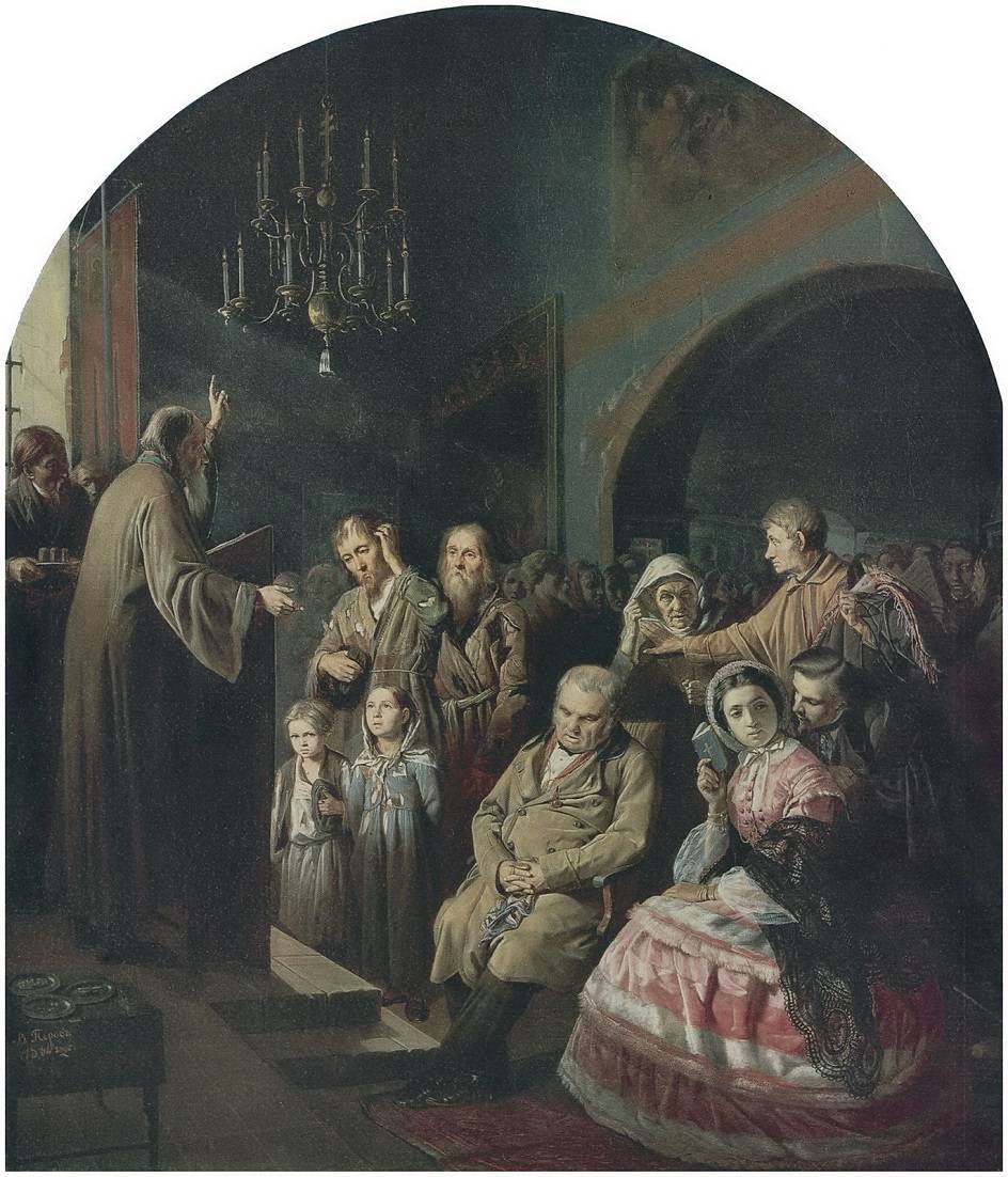 Школа живописи была окончена Перовым в 1861 году. В копилке художника оказалась золотая медаль 1-го класса за произведение «Проповедь в селе». Описав бытовой сюжет и специфичный социальный срез, в том же году Перов создал картину, аналогичную по стилю и тематике, «Сельский крестный ход на Пасху».