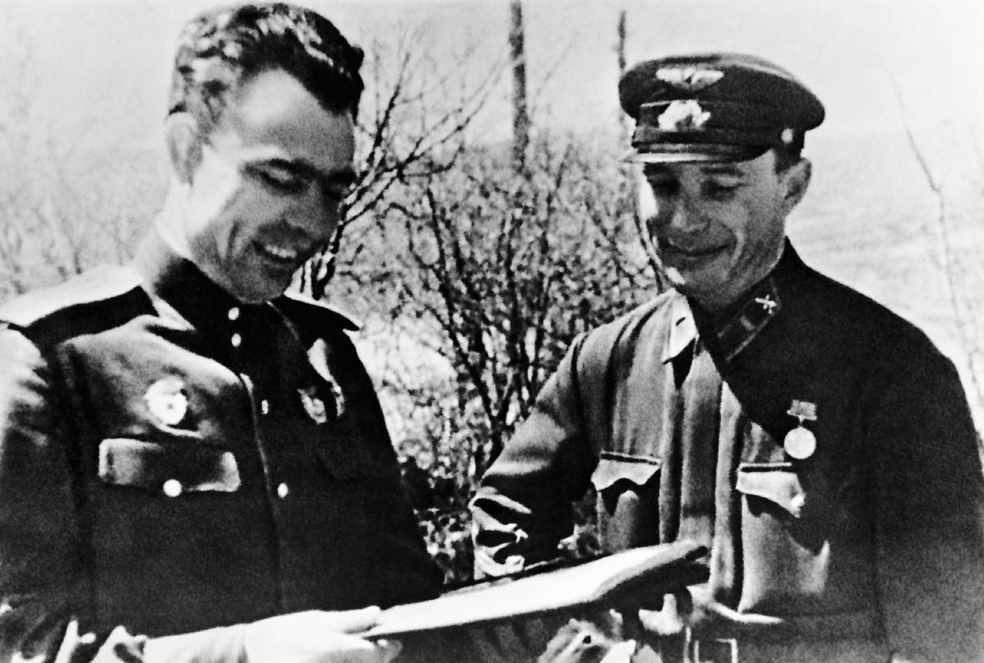 - Полковник Леонид Ильич Брежнев со своим адъютантом Иваном Павловичем Кравчуком. Плацдарм Малая Земля, 1943 год