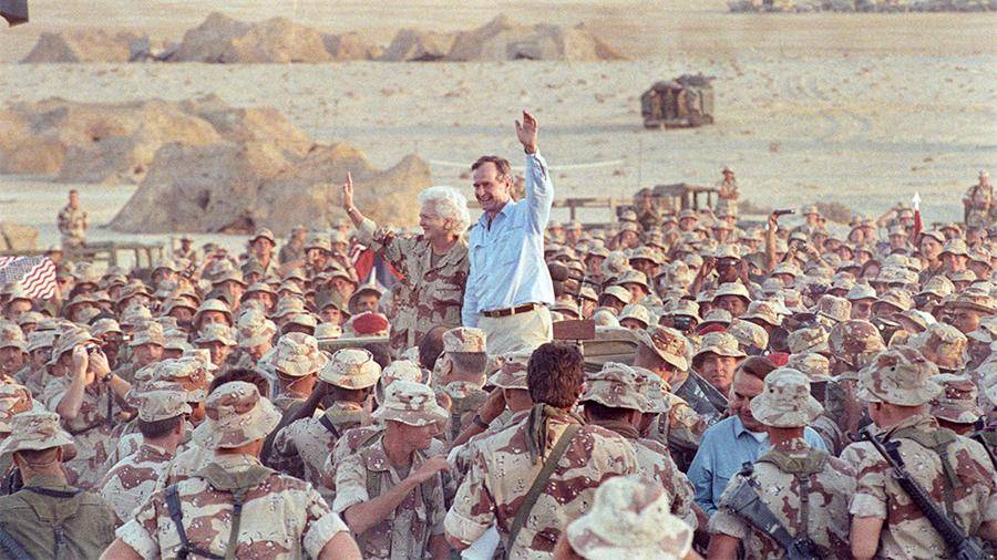 Президент США Джордж Буш среди морпехов США и бойцов британской 7-й бронетанковой бригады во время визита в саудовскую пустыню в 1990 году