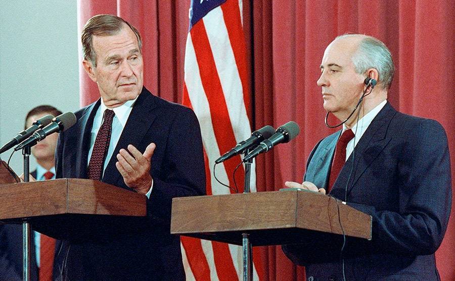 Американский президент подписал с Михаилом Горбачевым важное соглашение, направленное на сокращение так называемой «гонки вооружений». Позже, в 1992 г., США и Россия, в лице Буша-старшего и Бориса Ельцина заключили договор о полном прекращении «холодной войны» между государствами
