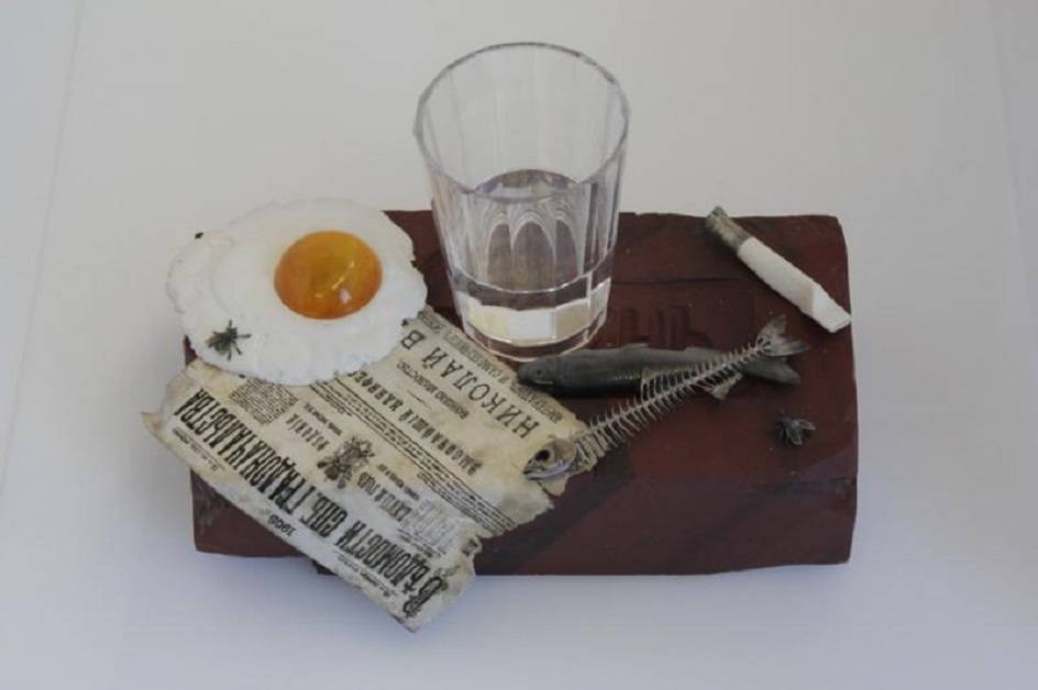 Среди других работ Фаберже — уникальный натюрморт 1905 года, который представляет собой камень, на котором разложен «джентльменский набор»: яичница, гранёный стакан с недопитой водкой, закуска и недокуренная папироса. Несмотря на кажущуюся простоту, натюрморт выполнен из самых дорогих материалов: кирпич выточен из яшмы, белок — из белого камня, желток — из янтаря, газета, рыбки-закуска и мухи — из серебра, стакан и его содержимое — из хрусталя, а окурок — из хрусталя и кварца.