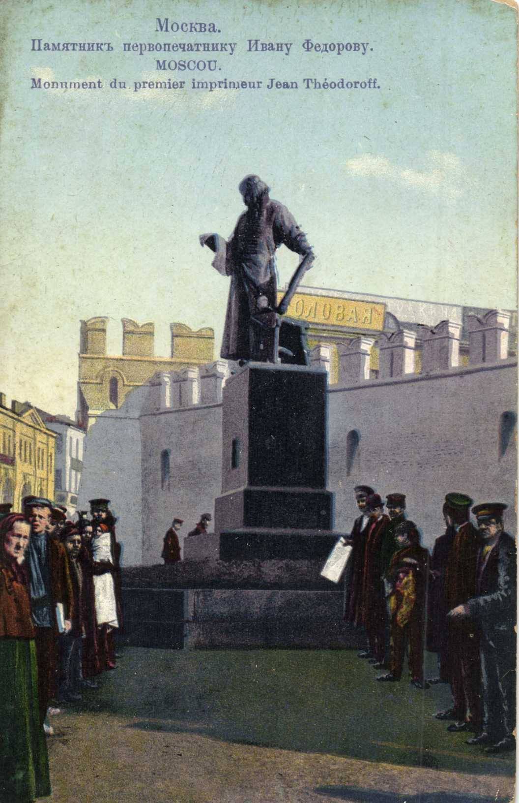 - В 1909 году в Москве у Китайгородской стены, напротив Синодальной типографии (древнего Печатного двора), был установлен памятник Ивану Фёдорову работы скульптора С. М. Волнухина. Изображения Ивана Фёдорова неизвестны, нет даже его словесного портрета. Волнухин совместно с художником С. В. Ивановым и историком И. Е. Забелиным создали обобщённый образ, этот образ и отражён в памятнике.