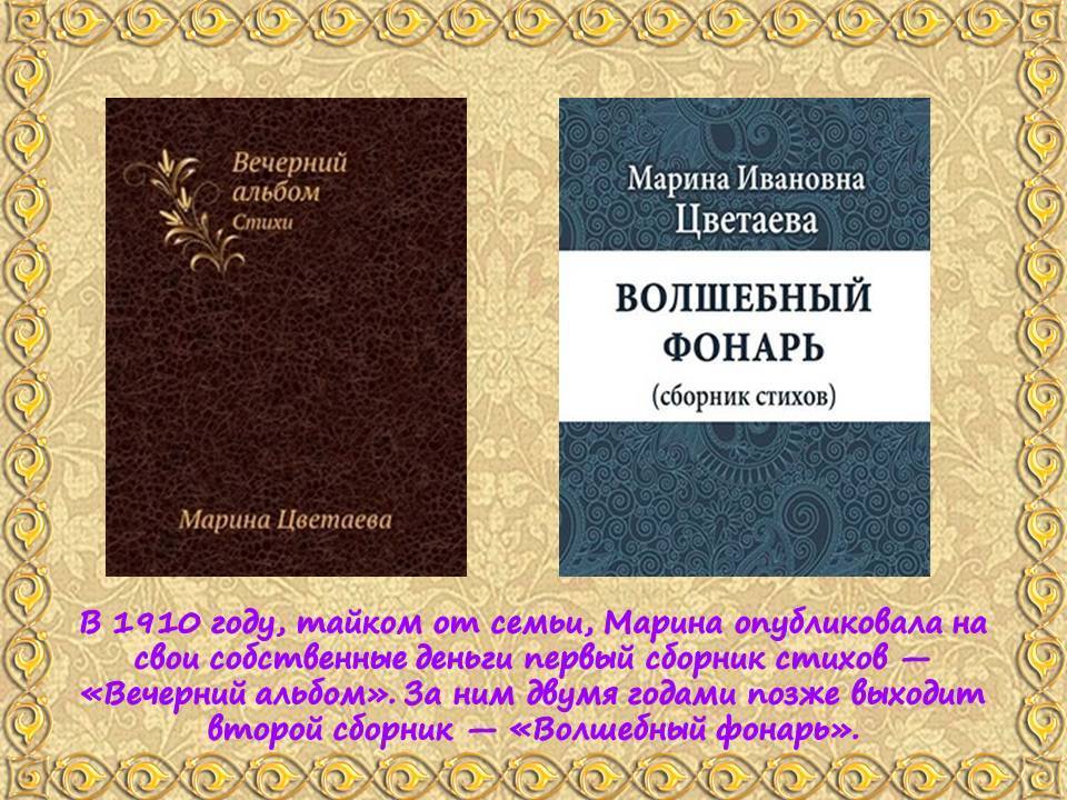 Первый сборник Марины Цветаевой под названием «Вечерний альбом» увидел свет в 1910 году. В основном он включал ее творения, написанные в школьные годы