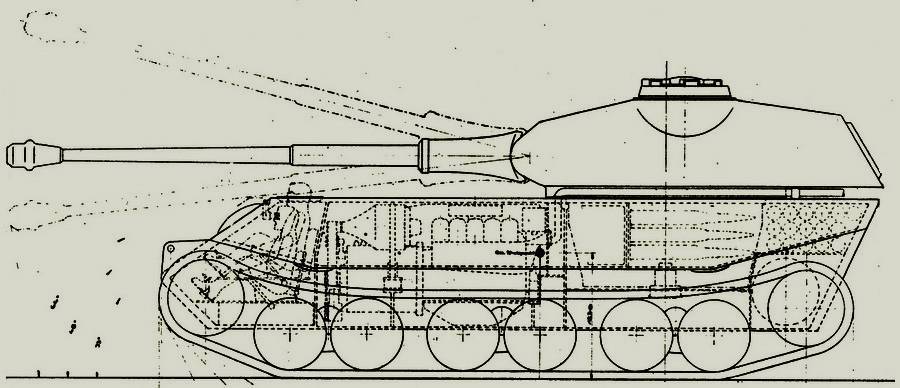 Вскоре был представлен проект 120-тонного Typ 205 с электрической трансмиссией, подвеской по типу «Тигра» от «Порше» и 16-цилиндровыми дизелем — с ним ожидалась максимальная скорость 20 км/ч. Чтобы не мудрить с транспортными гусеницами, инженеры предложили «утопить» ходовую часть в корпус.