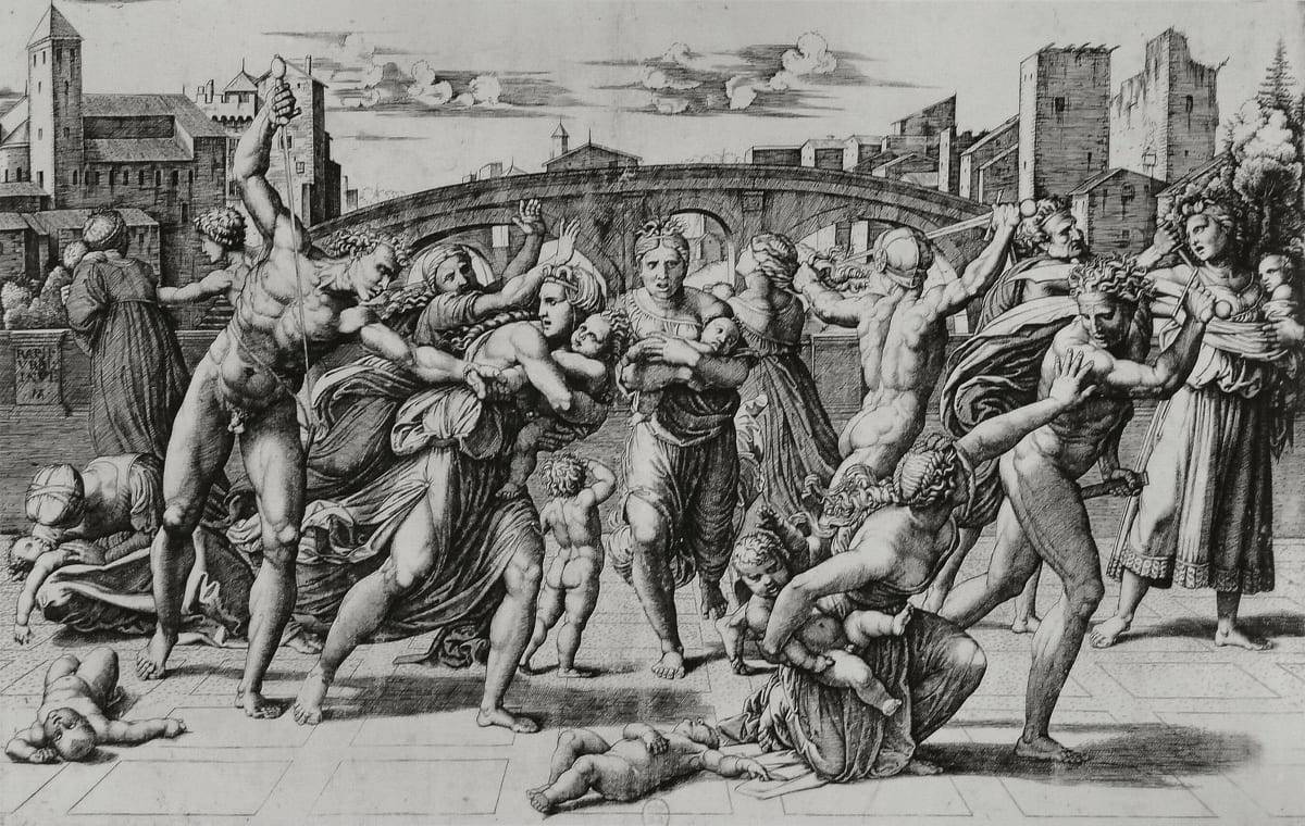 Сам Рафаэль не занимался гравюрами, однако он объединил свои усилия с одним из выдающихся итальянских граверов, Маркантонио Раймонди (ок. 1470 – ок. 1530 гг.). Раймонди вырезал гравюры, воспроизводившие известные картины Рафаэля и специально созданные им для этого оригинальные рисунки. Наиболее известными считаются гравюры, сделанные именно по таким рисункам, в том числе «Избиение младенцев» (ок. 1511 г.) и «Суд Париса» (ок. 1517 г.), гениально повторённой спустя столетия Эдуардом Мане в его легендарном «Завтраке на траве». Гравюры Раймонди способствовали росту популярности Рафаэля; сама техника гравюры была в те времена новинкой, но вскоре её приняли на вооружение и другие художники. Сам Раймонди работал со многими художниками, в том числе и с учеником Рафаэля Джулио Романо. Их союз прославился выпуском серии порнографических гравюр, а разразившийся в Риме по этому поводу скандал оказался таким громким, что в 1524 году Раймонд был на короткое время посажен в тюрьму.