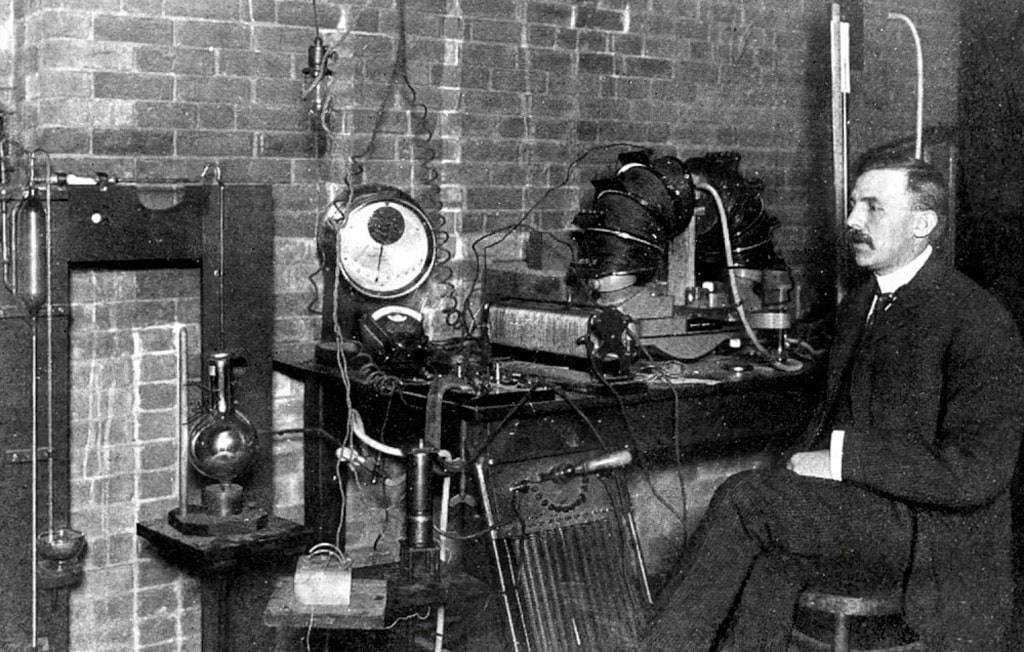 В 1895 году, будучи первым студентом-исследователем в Университете Кембриджа Лаборатория Кавендиша в Лондоне, Резерфорд, определила более простое и коммерчески жизнеспособное средство обнаружения радиоволн, чем ранее созданный немецким физиком Генрихом Герцем.