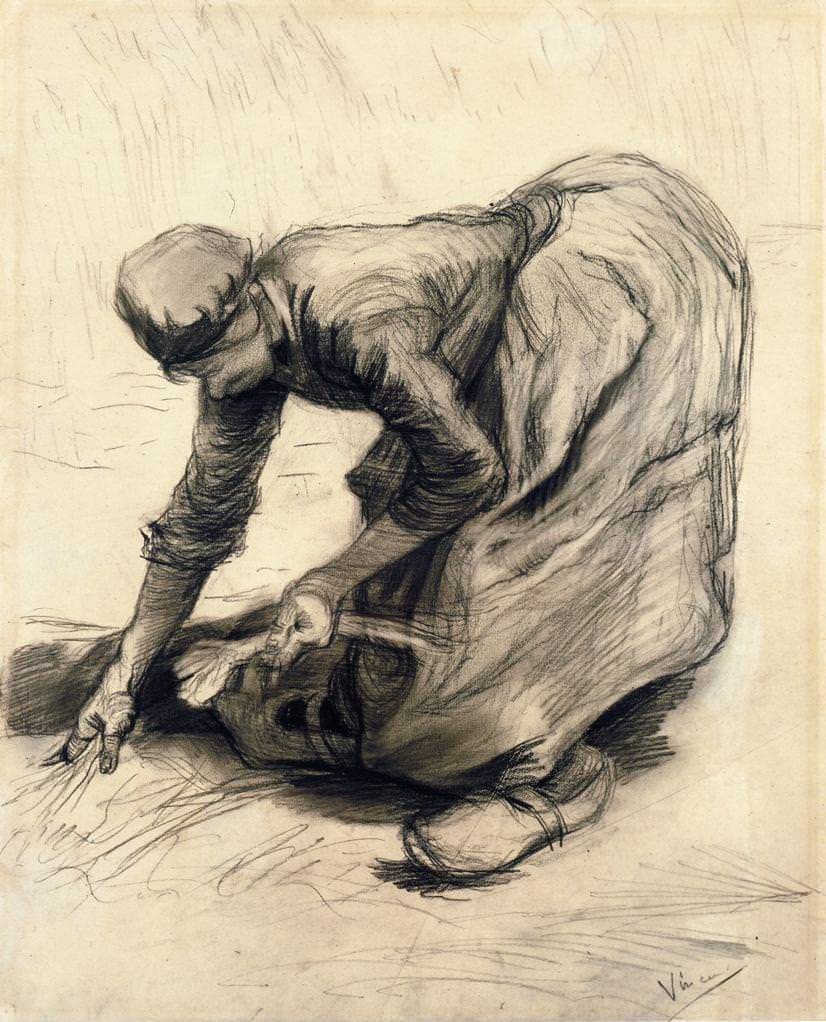 По мере того как росло мастерство художника, его штрих стал более быстрым и отрывистым, оживлявшим рисунок. Эту новую технику демонстрирует рисунок Ван Гога «Крестьянка, собирающая колос», 1885 года.
