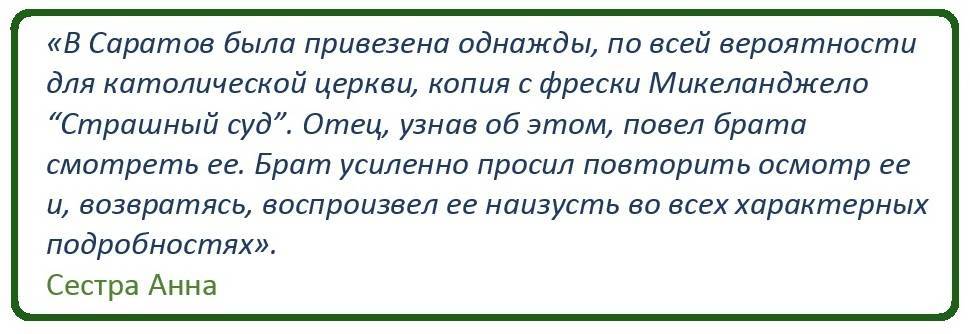 Старшая сестра Анна вспоминала о брате: «Он зарисовывал с большой живостью сцены из семейного быта». В 1865 году с ним произошло удивительное событие: